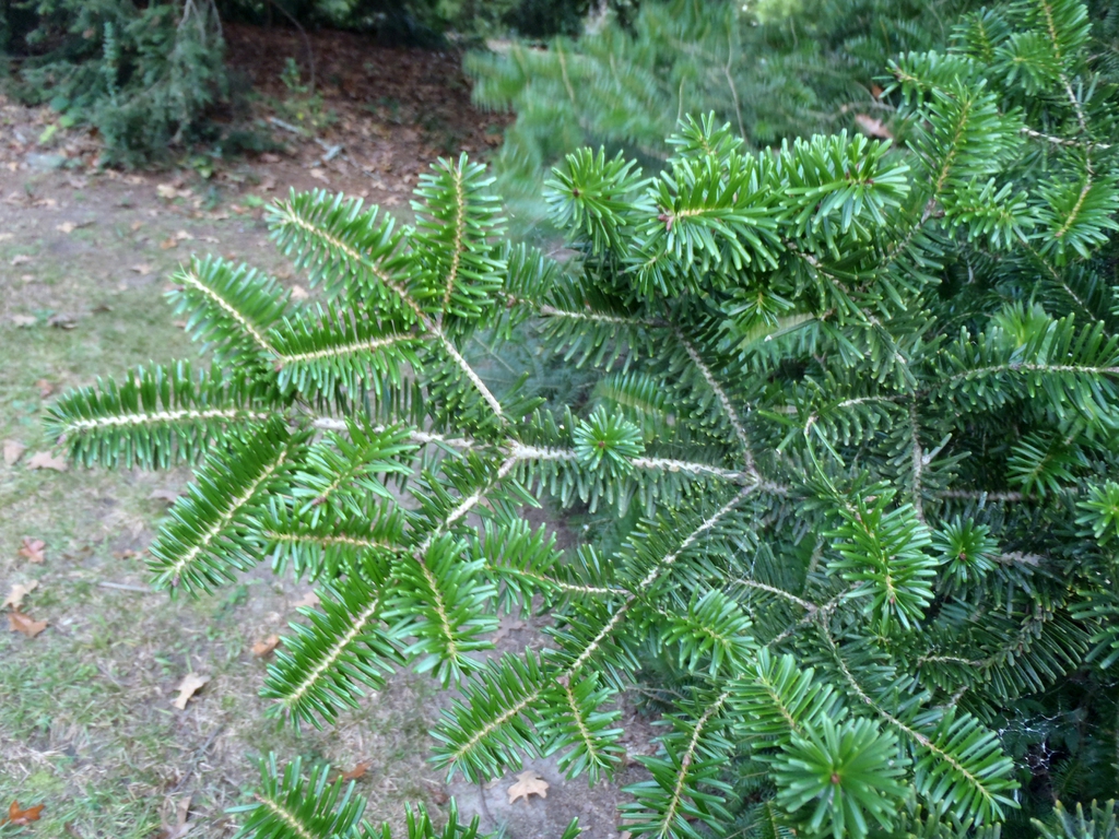 - Needles 0.8 to 1.5 inches long, dark green, fragrant, flattened, spreading at nearly right angles from the shoot and strongly two-ranked. Needles are notched at the base and sharply pointed at the tip. They are bright green above, and greyish-green below with two, broad, longitudinal stripes.