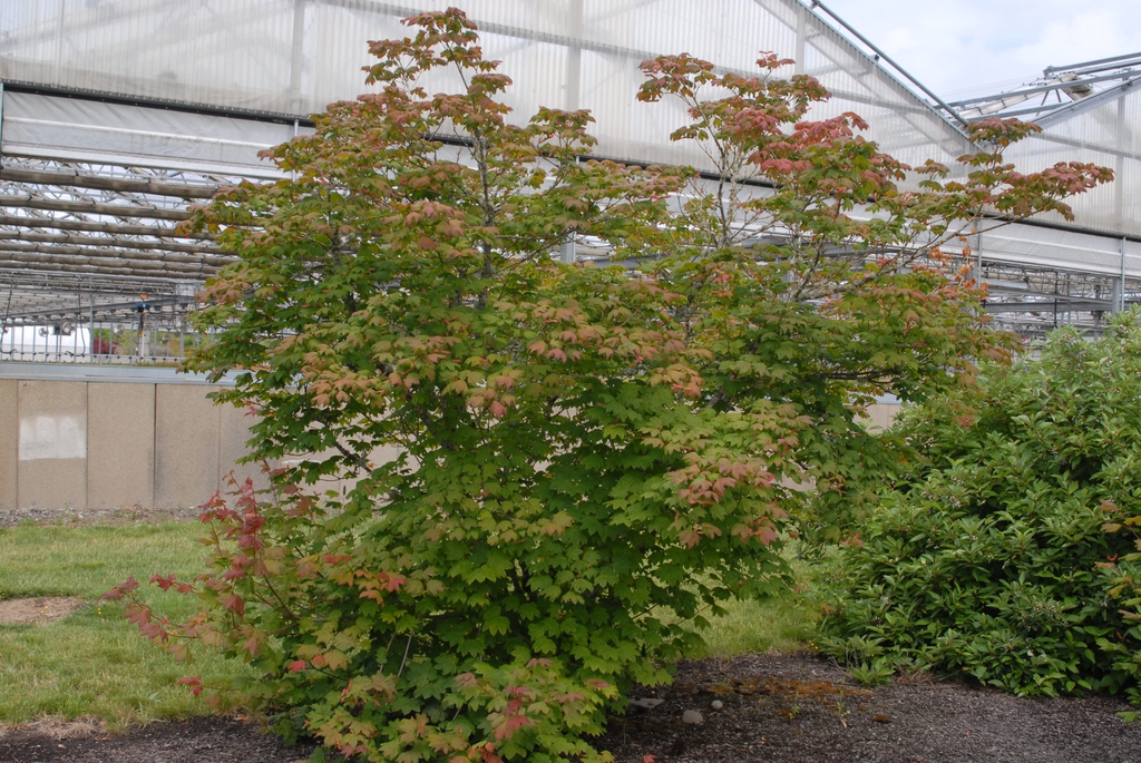 Vine maple grows 10 to 25 feet tall and 15 to 20 feet wide, it has an upright character in sunny locations but has a delicate horizontal habit in the shade. Grow this tree in partial shade in humus-rich well-drained moist soils for best performance. Consistent moisture is ideal and t will not tolerate hot dry conditions. Heavy pruning is not recommended or its unique form will be lost. Propagation is vegetative layering.