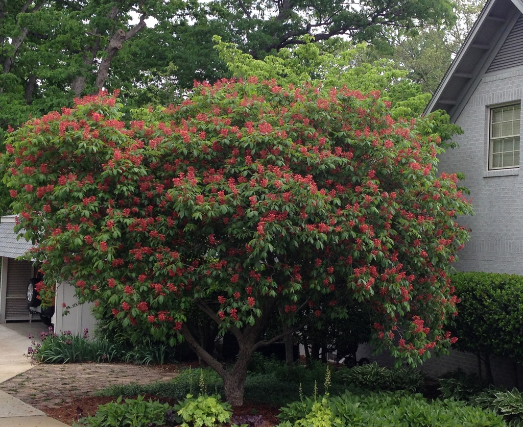 It is quite ornamental in spring when tubular, red flowers appear in 6 to 8 inch upright clusters that last for about a month and attract hummingbirds and butterflies. Flowers are followed by 1 to 3 shiny brown seeds contained in a three-parted smooth husk which can be numerous. The fruit is not edible by humans but squirrels love them. The attractive palmate leaves turn red and usually fall by the end of September.