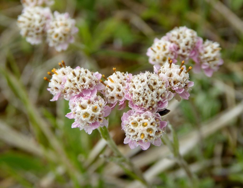 - The flowers are a cluster of fuzzy, white to pink flowers on 6 to 12 inch long stout stalks. Blooms in late spring to early summer. Plants are dioecious (male and female flowers on separate plants), with male flowers typically appearing on shorter flower stalks. Bristle-like hairs occur on the flower heads.