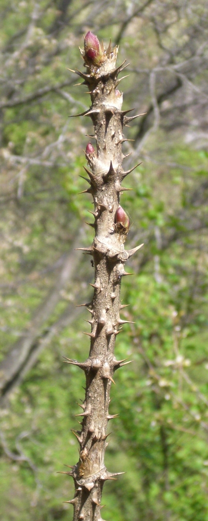This plant has large compound leaves clustered near the end of branches, giving it an umbrella-like appearance. The showy flowers occur in late summer in long panicles and are followed by round black drupes in fall. There are many sharp spines on the branches and and trunk of this tree.