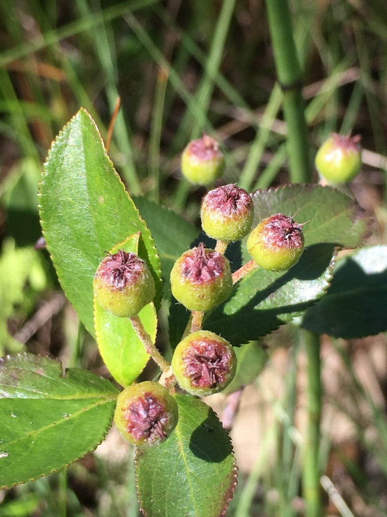 Black chokeberry is a deciduous shrub from the Rosaceae family that spreads freely and suckers profusely. The top is often rounded and upright; it tends to become leggy with age. The fruit is edible though very astringent and is produced from 5-6 flowered clusters that bloom in late spring. The leaves turn red in the fall and will drop for winter. It is native to Eastern North America. Can be used as a shrub in borders or in more open wooded gardens. This plant does well in full sun and partial shade and tolerates a wide variety of soil types including wet boggy soils.