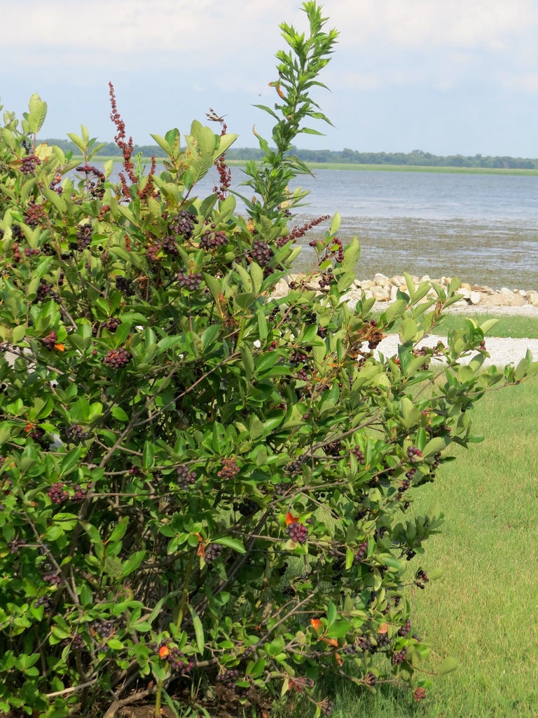Large black fruits, shrub 4-6 feet tall; red fall foliage