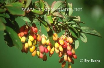 The yellow flowers appear in pendulous clusters in spring and are followed by showy oval red berries that may persist into winter. The spiny dark green leaves turn a deep purple in fall. There are numerous spines on the stems.