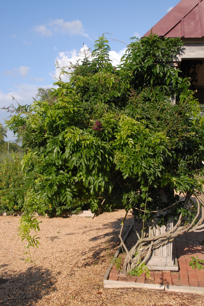Evergreen wisteria is a native of China, NE Vietnam, and Taiwan. Like true wisteria it is a woody climber with racemes of pea like flowers. However, as you can tell from its scientific name, Callerya reticulata, it is not a wisteria although both plants are part of the Legume (bean) family and the growth habit, leaves, flowers and fruit are similar. The genus name is in honor of of Joseph Callery, a French 19th century French missionary who traveled and collected botanical specimens in China. The species name 'reticulata' means 'netted' and refers to the pattern of the veining on the leaves.