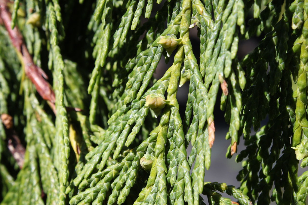 - Scale-like leaves in flat fans in 4 rows of alternating opposite pairs. They have an unpleasant smell when bruised or crushed.