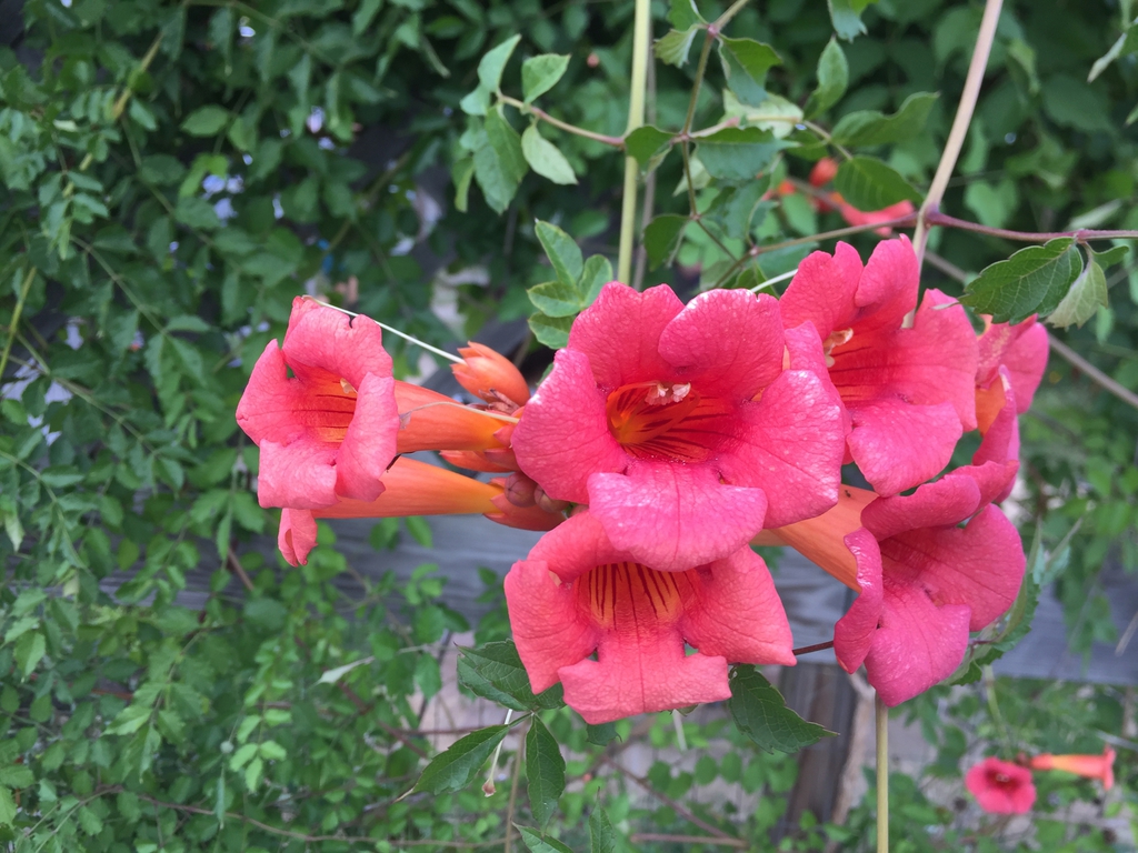 - The Trumpet creeper has clusters (terminal cymes) of red trumpet-shaped flowers (to 3” long) that appear throughout the summer (June to September). Its flowers are very attractive to hummingbirds.