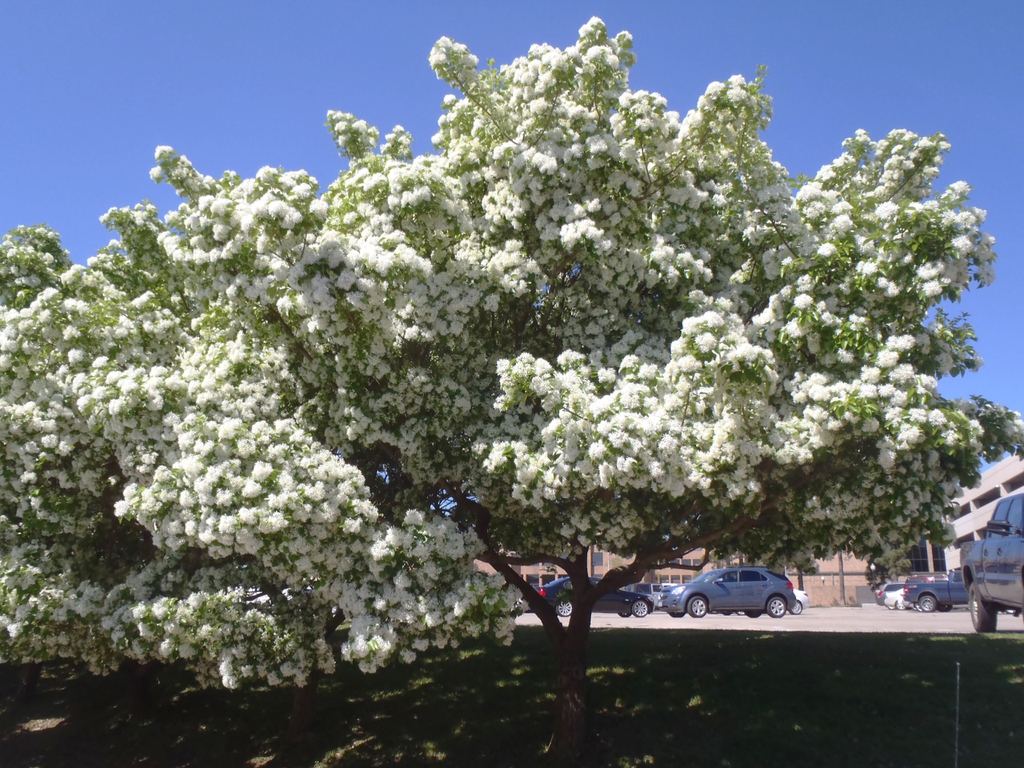 - This plant has snow-white, fragrant flowers in 4" panicles at ends of shoots. This tree displays a showy, white, clustered bloom that appear like fringe each spring.