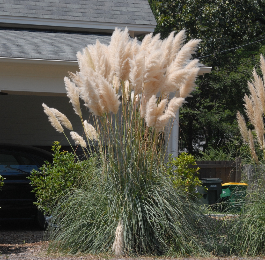 Pampas grass is a large ornamental in the Poaceae (grass) family originating from South America. Large, dense, grassy mound, 6-10' x 6-10'.