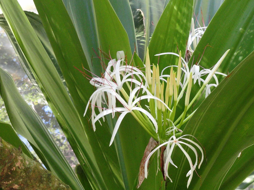 - Large lily-like flowers are up to 4 inches across and long and appear in umbrels of 2-6. They have long narrow separated petals that curve back. They are white to blush pink with long purple stamens and anthers extending outward. Blooms June- Nov.
