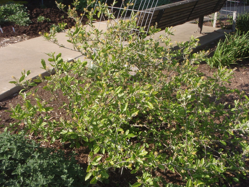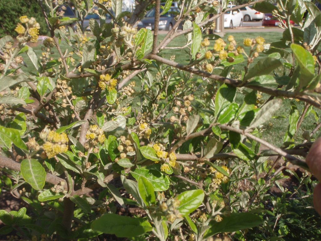 It is a loose, open, semi-deciduous shrub, reaching around six feet in height with a spreading, mounding habit. The foliage is bright green above and silvery below, with the older leaves turning a showy pumpkin-orange in the fall. The foliage is also quite fragrant, described as resembling apples or bananas. In some milder climates, the foliage may remain on the plant with showy green to orange coloring. The foliage also allows the plant to survive in extremely dry conditions. The glistening silver scales of the leaf underside allows it to reflect sunlight which in turn reduces the plant's heat load.