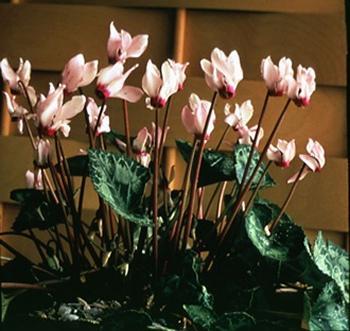 Cyclamen comes from the Latin word "cyclamnos." It is derived from the Greek word "kylos," which means circle or wheel. This refers to the shape of the plant's tubers. Cyclamen has many common names, including its genus name. Other common names include Alpine Violet, Persian Violet, and Sowbread. The name Sowbread originated because apparently, pigs like to dig and eat the tubers. Cyclamens are not Violets nor are they native to Persia. It is unclear how the Persian Violet name originated.