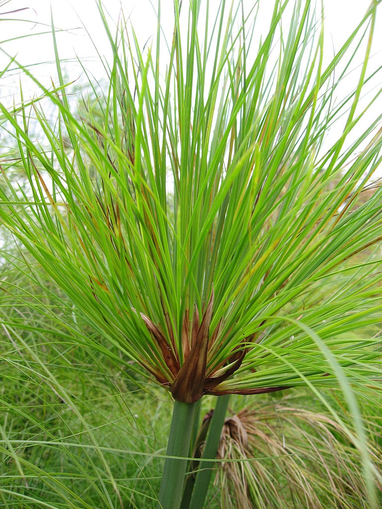 Papyrus is a large, emergent, aquatic perennial sedge from Africa that produces rhizomes covered in thick, black scales. It grows 10-15 feet high with unusual feather-duster-type heads composed of thin rays and elongated bracts. In NC it is used as a container plant or annual. It needs boggy soil or standing water in full sun to partial shade.