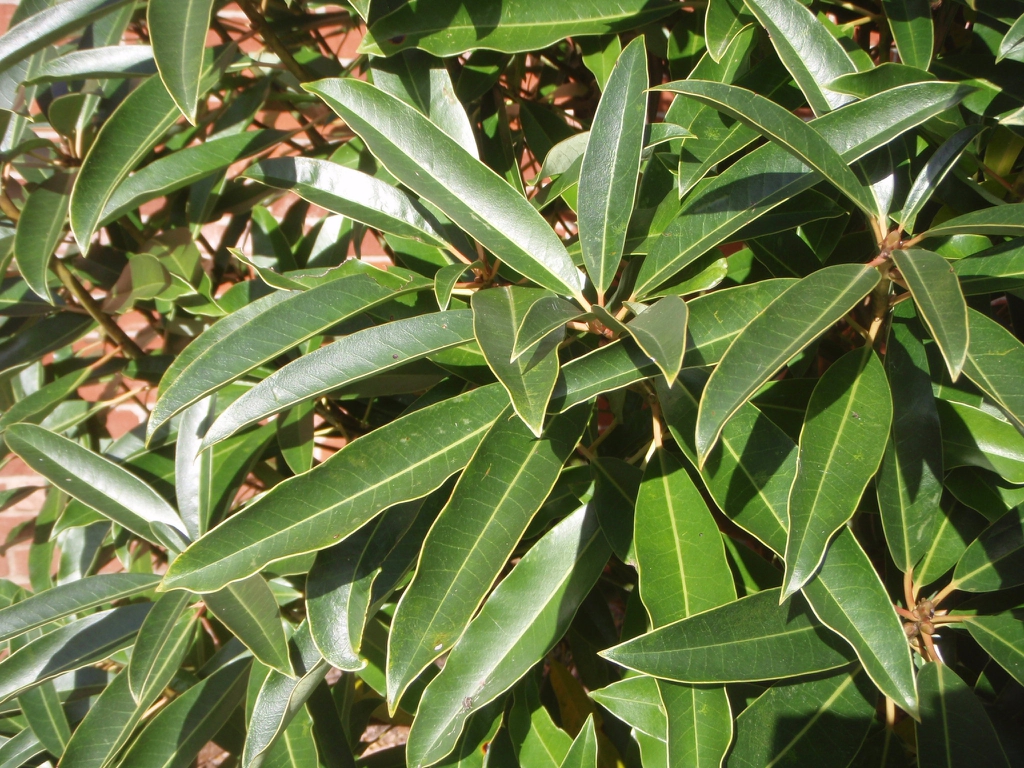 An evergreen shrub in a haystack form with alternate, simple, leathery, lustrous, dark green leaves; 5-10 in. long with red petioles and silvery gray on the underside. Contains fragrant, pale green flowers in summer with 0.3 in. bluish black drupes on female plants. Prefers light shade in well-drained soil rich in organic matter.