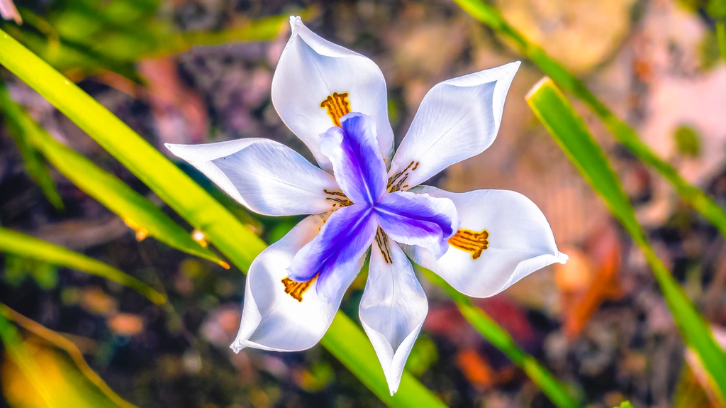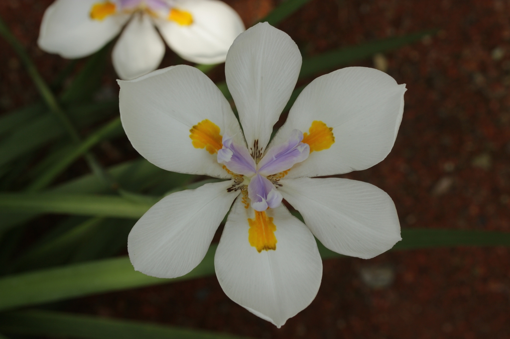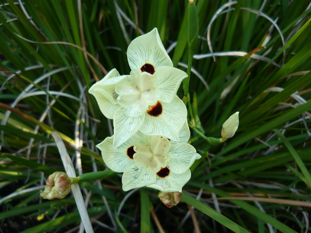 - Three inch wide flowers are white with yellow and blue markings resembling a small Japanese Iris. Flowers appear on branched stalks from spring to fall and intermittently throughout winter. Flowers last one day, but are quickly replaced. Each flower stalk carries a large supply of buds. Flowering occurs in bloom bursts that often occur at 2 week intervals.