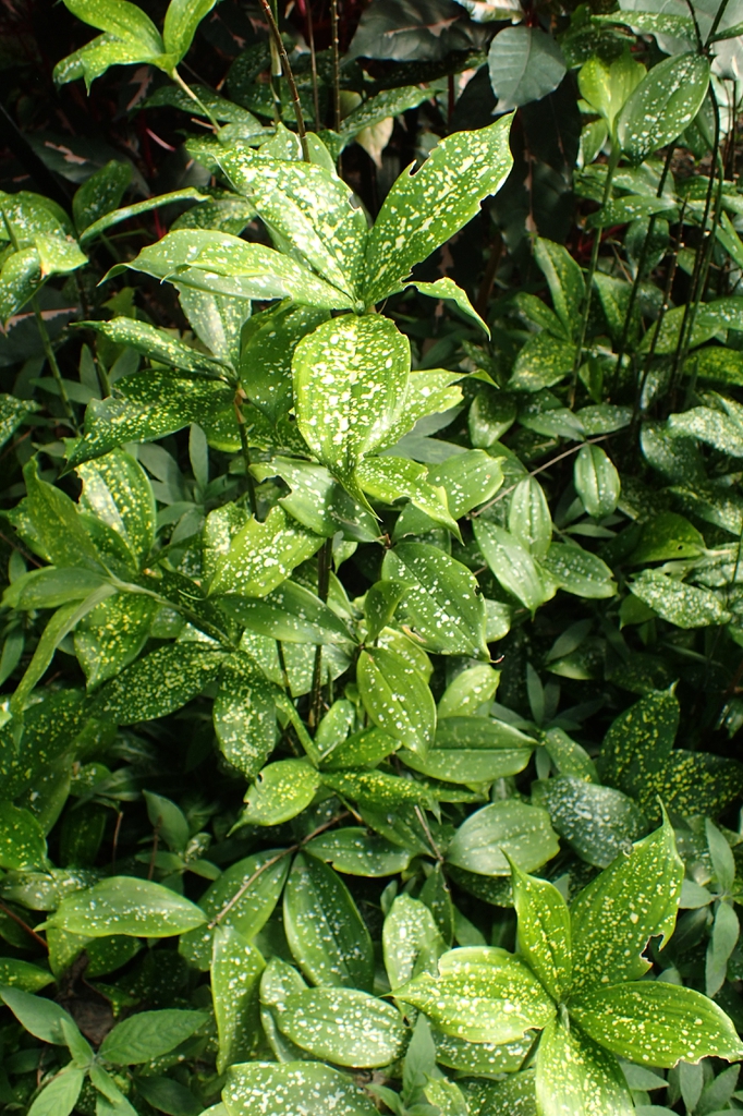 - 3-inch opposite or whorled leaves are glossy dark green with spots of creamy yellow. New leaves appear as tightly rolled cones
