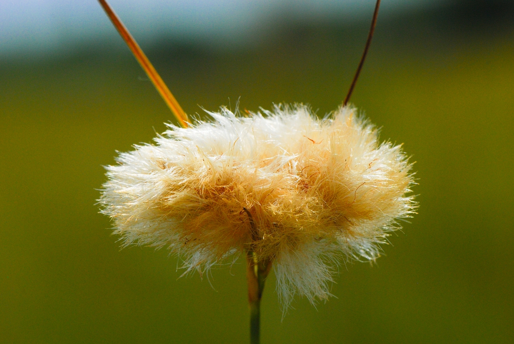 This unique sedge, with flowers that look a bit like a shaving brush, is a perennial. It grows in bogs, wet meadows, and many other places with sun and damp or wet soil. It is one of many cottongrass (common name) cultivars with a flower that has a white to tan bristly appearing but soft, cotton like mass 1 to 2 inches across. Many cottongrass blooms are white but this one is often tawny (light brown) in color, hence one of its common names of Tawny cottongrass. It blooms from June to September. The flowers are perfect, meaning both male and female parts are present.