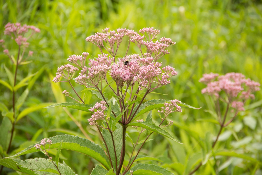 Hollow Joe Pye Weed is a native herbaceous perennial typically found in the low moist ground of meadows, woods, and fields. It is an erect and clump-forming plant that usually grows to 4 to 7 feet tall. Its great height makes it a dramatic accent in the back of a garden. Hollow Joe-Pye Weed prefers damp, moist to wet, rich soils, but it will also grow in gravelly or sandy soils if there is sufficient moisture. It prefers full sun to partial shade and neutral to slightly acid soils. This plant is moderately resistant to damage from deer and the flowers are attractive to pollinators, including bees and butterflies. Songbirds eat the seeds.