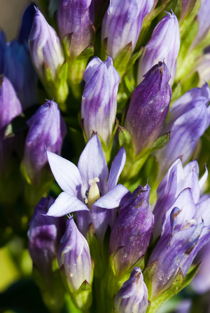 - Violet to white, funnel-shaped flowers in multiple tight clusters that are held stiffly upright. Produces dozens of tubular, .5-1 in. flowers with five triangular bristly-tipped lobes from August through October.