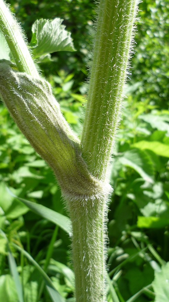 - The stem is grooved, hollow, and stout, green with purple splotches. White wooly hairs circle the stem at the base of the leaves. They have a strong pungent odor when crushed.