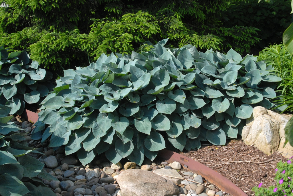 Hosta 'Halcyon' is an herbaceous perennial in the Asparagaceae (asparagus) family and a cultivar in the Tardiana Group of hostas. This plant has flat, blue-green, spear-shaped, or heart-shaped leaves and is grown for its beautiful foliage. It is considered one of the best blue hosta cultivars, retaining the leaf color longer than other varieties. Its blue-violet, bell-shaped flowers appear in mid to late summer and appear as racemes along 26 to 28-inch scapes.