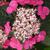 Lacecap type with deep pinkish red (or blue) flowers. Stems and leaf veins reddish.