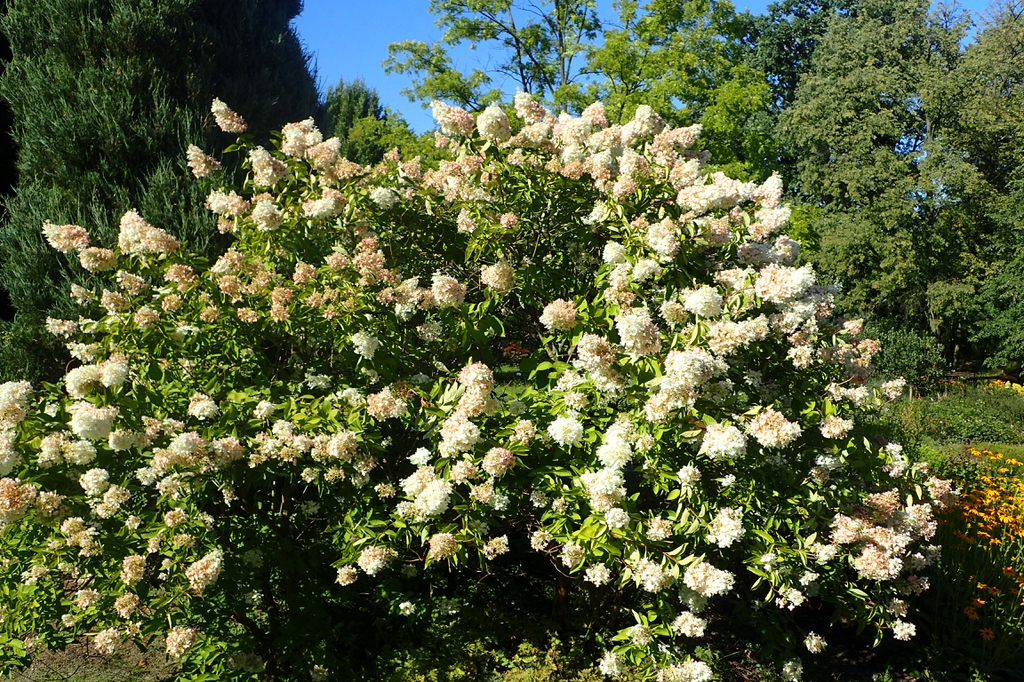 - 6-8 inch long cone-shaped panicles of many creamy white mostly sterile flowers that may become pink-tinged. Blooms mid-summer to fall. Individual flowers have 4 petals. Can reach 12-18" long, 6-12" wide at base. White changing to purplish pink, almost all are sterile, yellowish white, showy, each with 4-5 normally toothed sepals, strong scent.