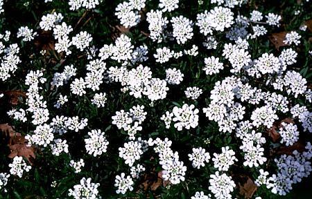 Candytuft is a low-growing, spreading, evergreen ground cover that may be classified as herbaceous perennial or sub-shrub. It has a mounding and sprawling habit and measures 6 to 12 inches in height and 6 to 18 inches in width. It has a woody interior and is evergreen in warmer climates and semi-evergreen in colder climates. Flowers emerge in the early to late spring and are small, white, 4-petaled, and appear in dense clusters. The foliage is nearly hidden by the profuse flowers. The leaves are narrow, dark green, leathery, and measure 1 to 1.5 inches long. Candytuft is a woody subshrub but is often treated as a herbaceous perennial.
