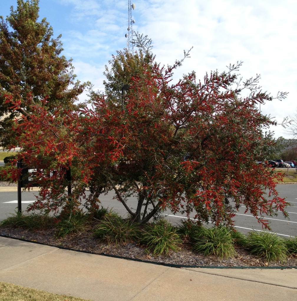 Yaupon holly is a woody, broadleaf evergreen shrub or small tree in the holly family (Aquifoliaceae), native to the eastern United States and Mexico. The common name 'yaupon' is derived from Catawban. The leaves of the parent plant were used for ceremonial tea, which, when consumed in large quantities, caused the purging commemorated by the specific epithet vomitoria.