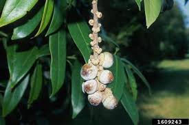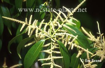 The Henry Tanbark Oak is a flowering evergreen tree in the oak family and native to China. It is a relatively large, multi-trunked, tree reaching about 65 feet high at maturity. The crown is oval or rounded and the branches are smooth except for current year growth that has a thin, downy purpleish covering.The tree produces white, upright spikes of flowers in spring and acorns in the fall.