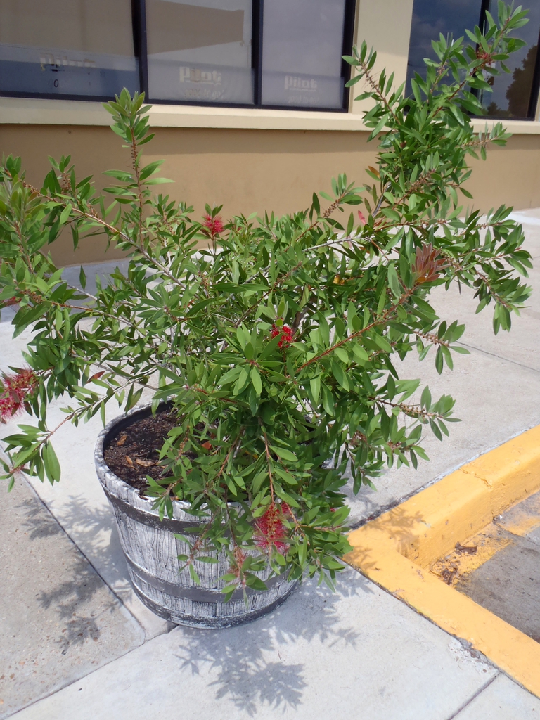 Crimson Bottle Brush is also listed under a synonym, the older name for the genus, Callistemon. These plants are very tolerant of pruning and old plants will regenerate if pruned back hard into the old wood. The plant has a moderate growth rate moving from a large shrub to small multiple-trunked tree that with patient pruning, can be trained as a single trunk small tree.