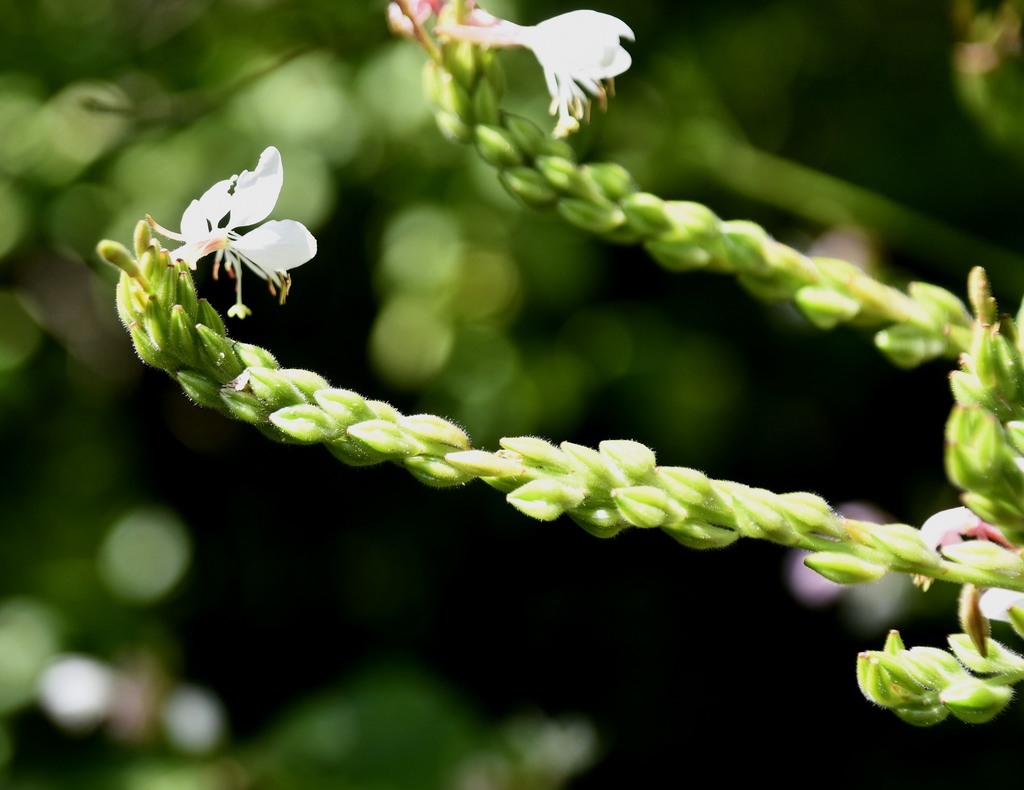 - Flowers bloom June-October and are white fading to pinkish in color. Flowers are 1/2 inch wide with 4 petals arranged fan-like. The long stamens are arranged horizontally to the petals. They appear in open panicles on spikes up to 6 feet tall.