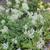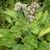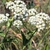- white flowers in compact heads clustered at the top of tall stems; five very small petals