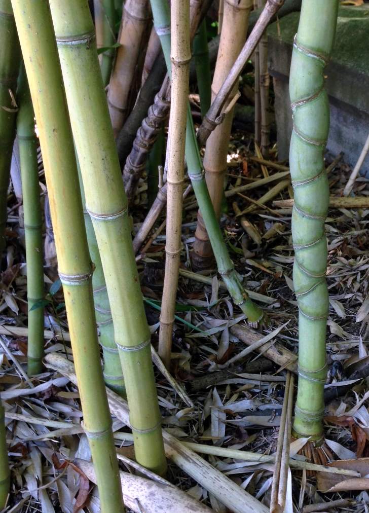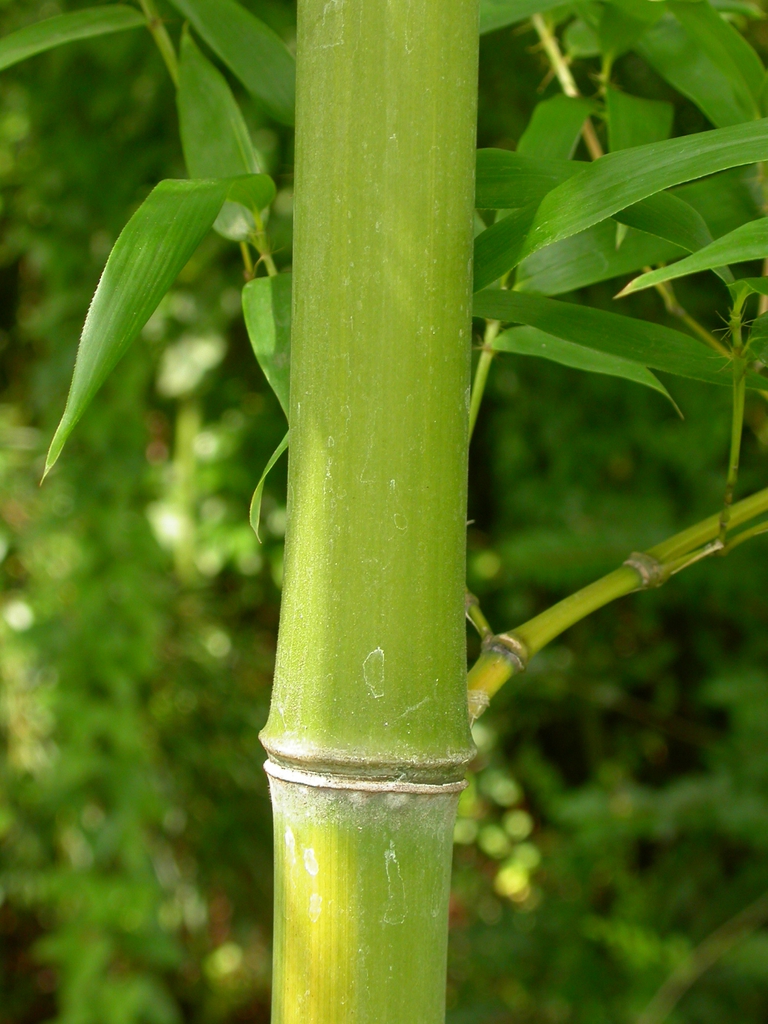 - Hollow green culms turn yellow in the sun as they mature and have a white node ring. Some canes have swollen internodes bunched up together at the bottom. Stems are flattened on one side and have a glaucous ring below every node.