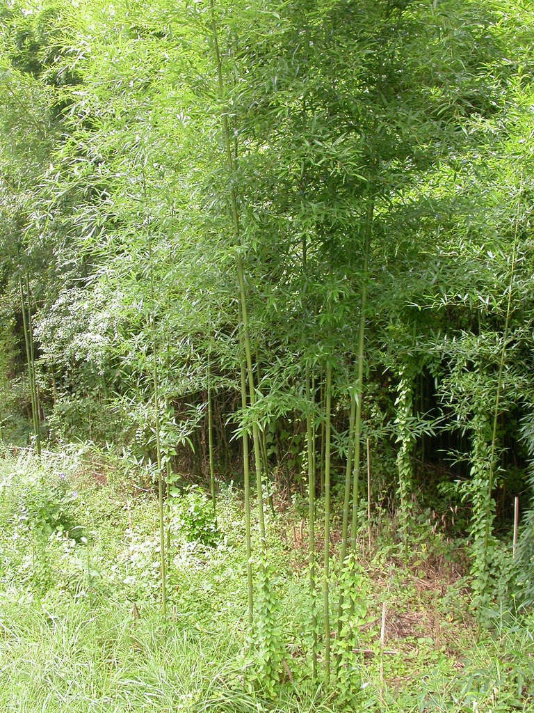 Golden bamboo is an invasive evergreen plant in the grass. family. It can reach heights of 30 feet but more typically it is in the 10-20 foot range. The plant was introduced to AL in 1882 as a landscape plant but has escaped gardens and spread aggressively. Despite efforts to contain it in hardscape, it tends to find a way out.