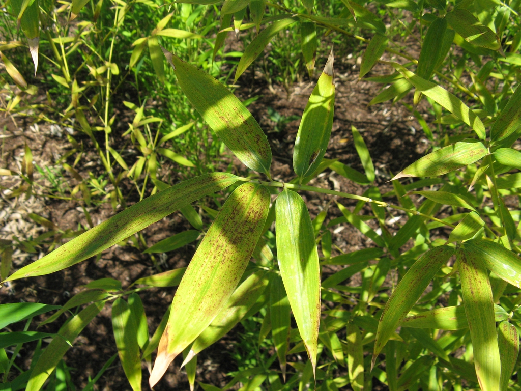 Short swollen internodes bunched at the base of the culms are characteristic of this bamboo. Most canes will have uniformly spaced sections (internodes) as the swollen internode trait only occurs on some canes. Culms (stems) are light green with a white node ring, turning more yellow if exposed to direct sun and with age. Flowers and seeds are rarely produced. The green leaves are up to 6 inches long and often grow in a fan shape alternately on the hollow stems.
