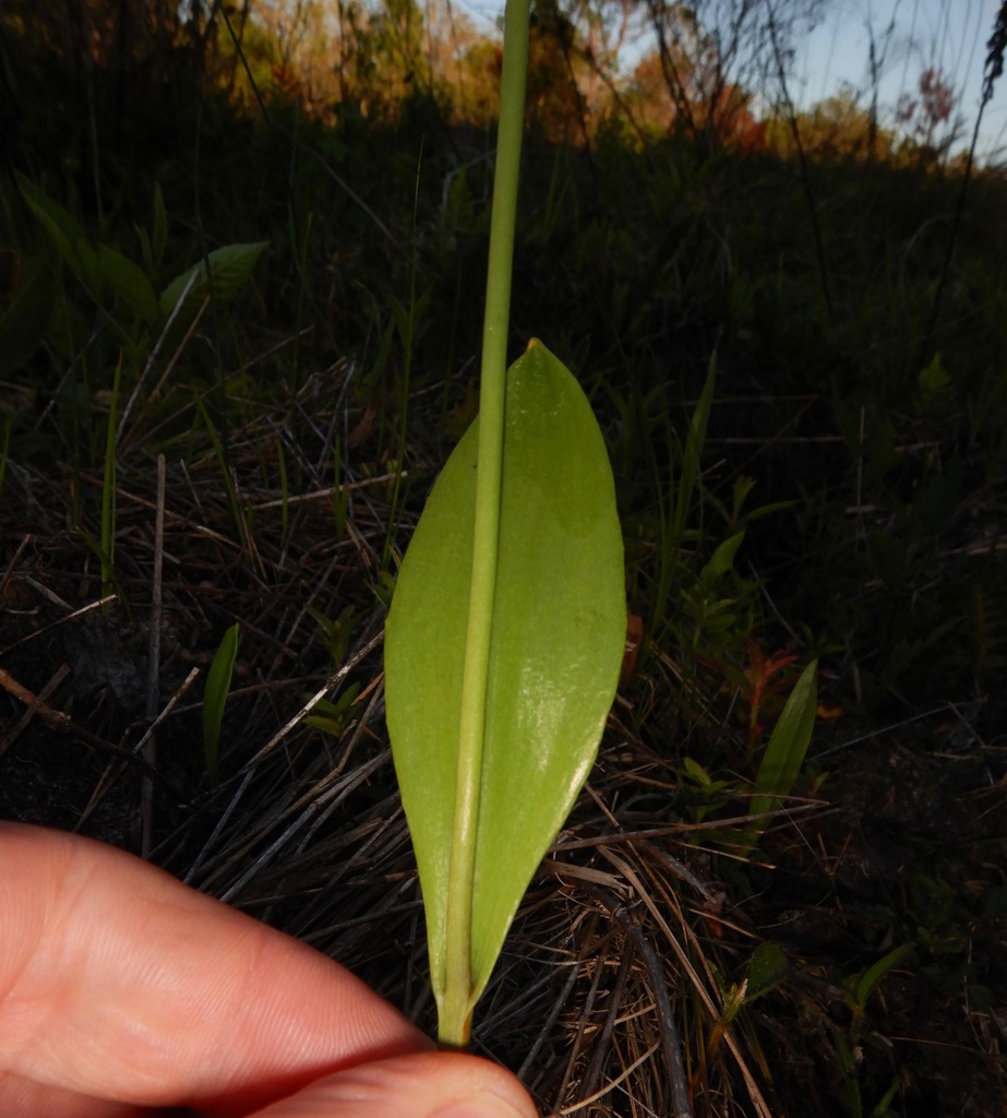 - 2 to 4 in. single leaf is located about midway on the stem; basal leaves are absent at flowering