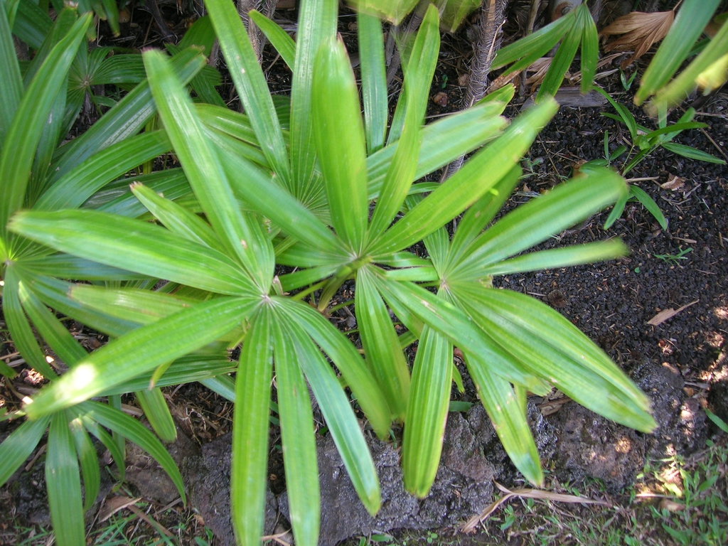 Lady palms are clustering palms that produce individual stems along underground rhizomes. When planted in the ground, the stems are not produced in a tight cluster, giving the impression of a copse of small palms. The fiber-covered stems are slender and support a crown of several palmately compound leaves.
