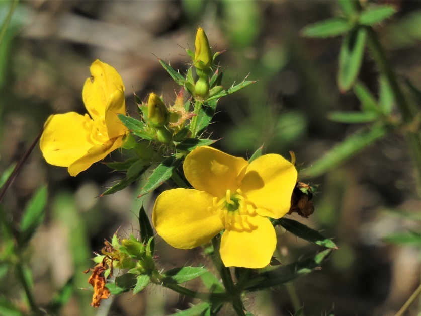 - 4 yellow petals almost rounded 1" across with straight stamens appear April-July. Other members of this family have curved stamens.