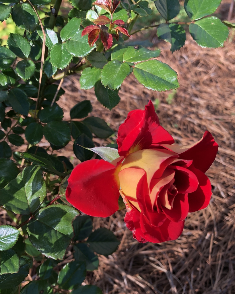The 3-4 in double flowers are deep red with a yellow reverse and a mild apple tea fragrance. They are high-centered to cupped, grow in clusters and repeat blooms in flushes through fall. Glossy green foliage provides a nice background for the flowers. Stems have prickles.