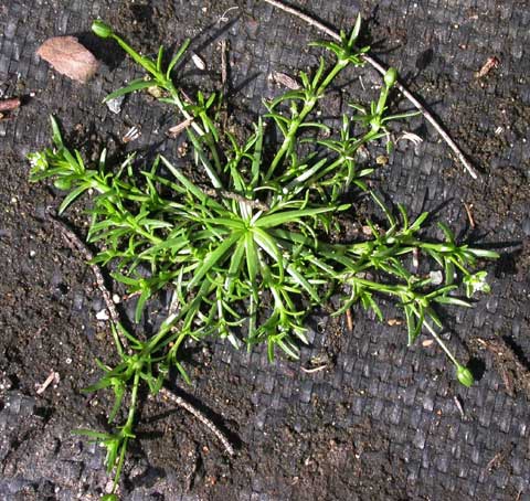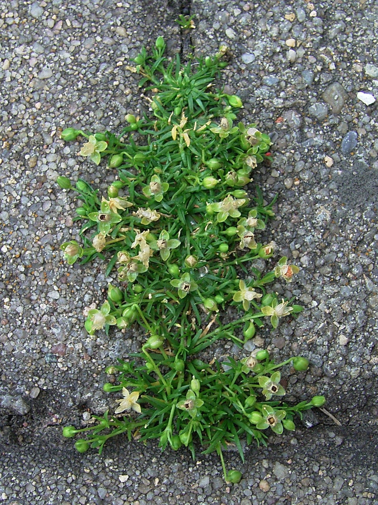 Pearlwort is generally seen near walkways. There are selections and related species sold in the garden trade for rock gardens or vegetation between pavers. This species of Sagina is nearly identical to S. decumbens. Both have thin, awn-like leaves that are 1/2 to 1 inch in length and can form dense mats.