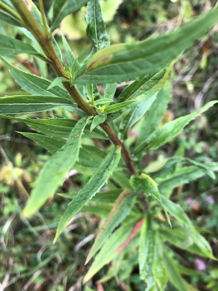- 4-6 inches long and 1 inch wide green leaves are lanceolate to broadly linear, alternate leaves and tapered with spaced sharp teeth. The surface is smooth with possible hairs on veins underneath.