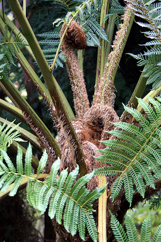 The bark of this fern is brown, fibrous, and there are oval leaf scars encircling the trunk. The fronds are delicate, medium-green, bipinnately compounded, and can reach up 13 to 20 feet in length. The stipes or stems of the fronds will fall off when the fronds die, leaving oval scars on the brown scaly stems. Young fronds are known as fiddleheads and have stiff white hairs. The brown sori appear in a single row on the undersides of the leaflets, close to the midrib.