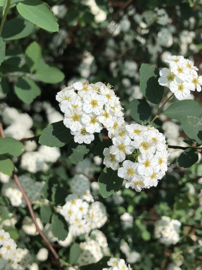 Spiraea × vanhouttei, called Vanhoutte spiraea or Bridal Wreath, is a an artifical hybrid plant in the Rosaceae (rose) family. This vase-shaped, deciduous, flowering shrub has cane-like branching that arches gracefully toward the ground. It is a hybrid cross between S. trilobata x S. cantoniensis that is noted for its showy spring blooms and hardy nature. The plant typically reaches a height of 8 feet with a slightly larger spread. The genus name comes from the Greek word speira meaning wreath in reference to the showy flower clusters seen on most shrubs in the genus.