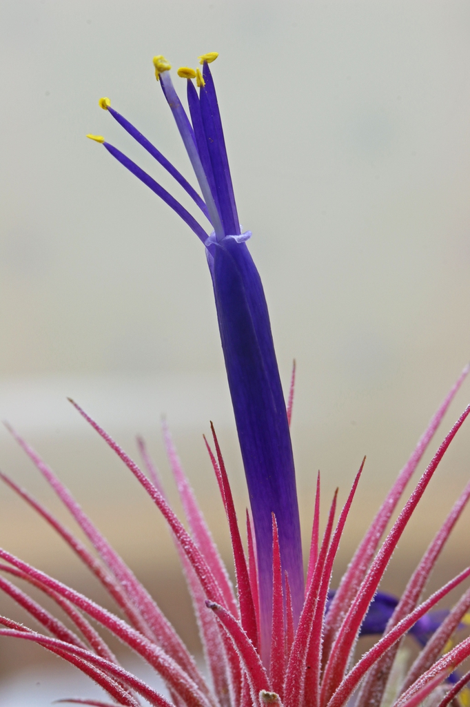 Air plant is a small, evergreen, epiphytic herbaceous perennial from Mexico and Central America. It is a member of the pineapple family (Bromeliaceae). The species epithet means “violet flower” and describes the most common color of the flower of the wild-type species.