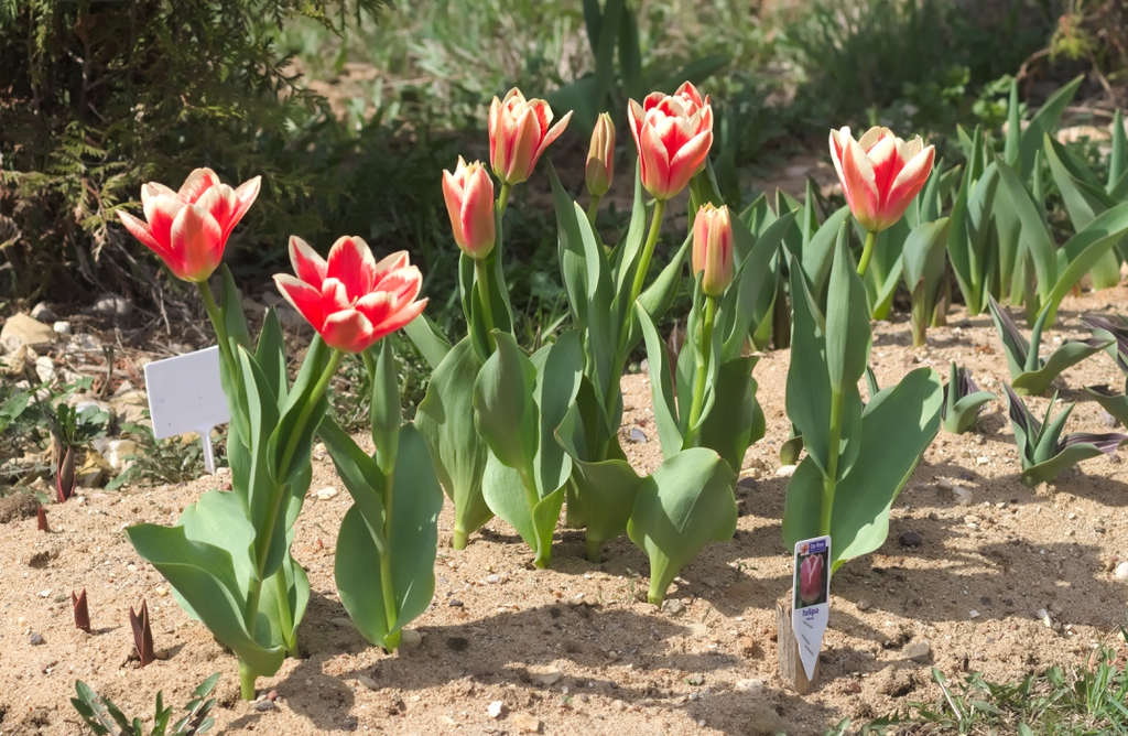 A wild species of tulips found in the mountains of Central Asia. It is not cultivated any longer but several of its cultivars are very popular. Plant the bulbs at a depth of 4-7", 4" apart in the fall for a beautiful spring show. Blooms in early spring and has a black 'eye' and rounded tepals. Tulips generally decline yearly when exposed to temperatures above 70 degrees F. They are best when grouped and mass planted. Variegation is due to a viral infection so patterns vary greatly.