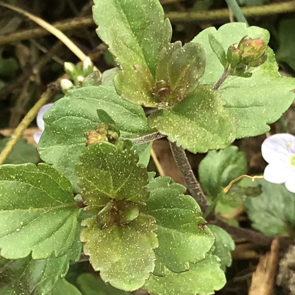 - Small blue-lavender 4-petaled flowers with dark veins and white eyes in spring.