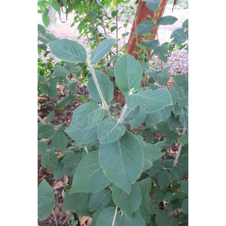 - Opposite, simple, oblong to elliptical, 3 to 6 inches long leathery green leaves turn bronze to dark red in fall