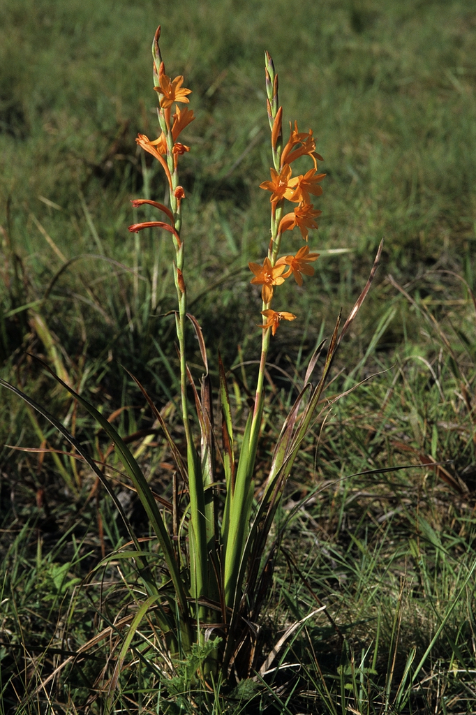 While a Watsonia's bloom can be in a variety of colors, the most common are coral, orange and light pink. Its clumps grow best in full sun with well composted soil. Consistent summer watering helps to increase the growth rate and cold hardiness. Large clumps are more cold resistant. Each clump can provide several dozen spikes of blooms, each spike with up to 25 flowers.