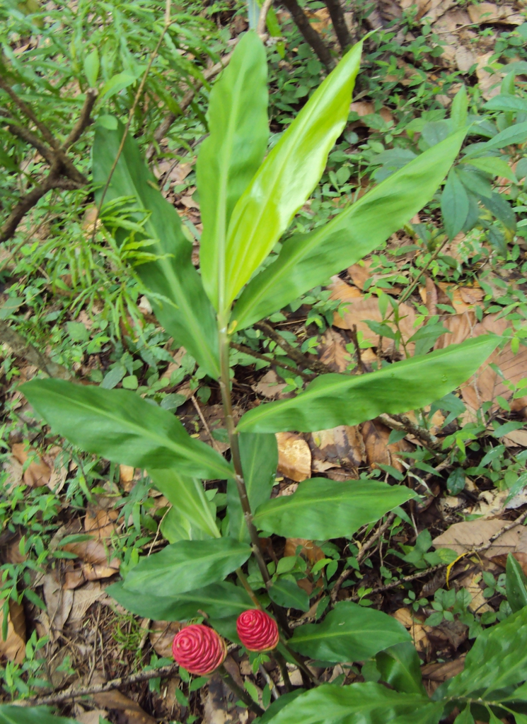 Near the end of its growing season, the flowers emerge from the ground. Starting out as a lime green cone shape. Small blossoms emerge from between the green flower bracts. After flowering, the bracts become a showy shade of red. If harvesting for use as a shampoo, this is the time that a slippery liquid is exuded from the flowers. This liquid has a soapy feeling and a ginger scent.